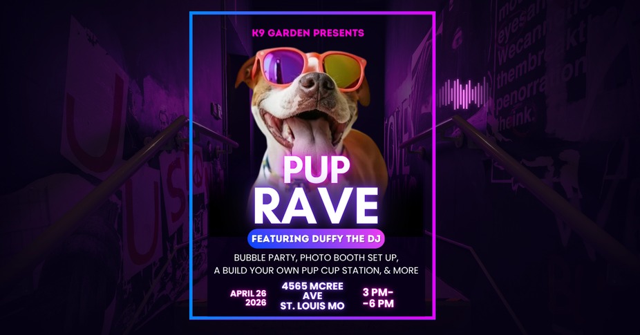 Join us at K9 Garden for our Pup Rave on April 26 from 3–6PM featuring Duffy the DJ. Expect high-energy music, a bubble party, photo booth, and a build-your-own pup cup station!